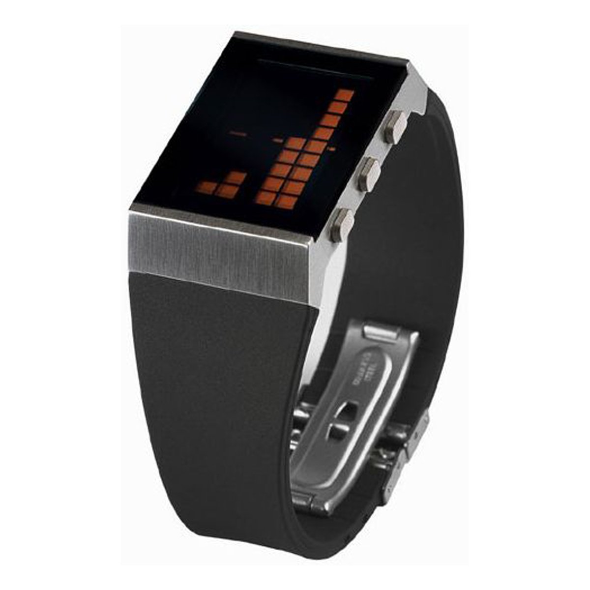 1 paveikslas: The LEXON NEO 8 Optical Watch, featuring a matte chrome casing and a black rubber strap with orange details.