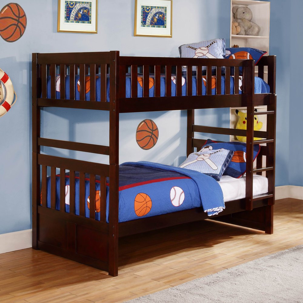 Figure 2: Assembled Homelegance Rowe Twin/Twin Bunk Bed with integrated storage drawers in Dark Cherry finish.