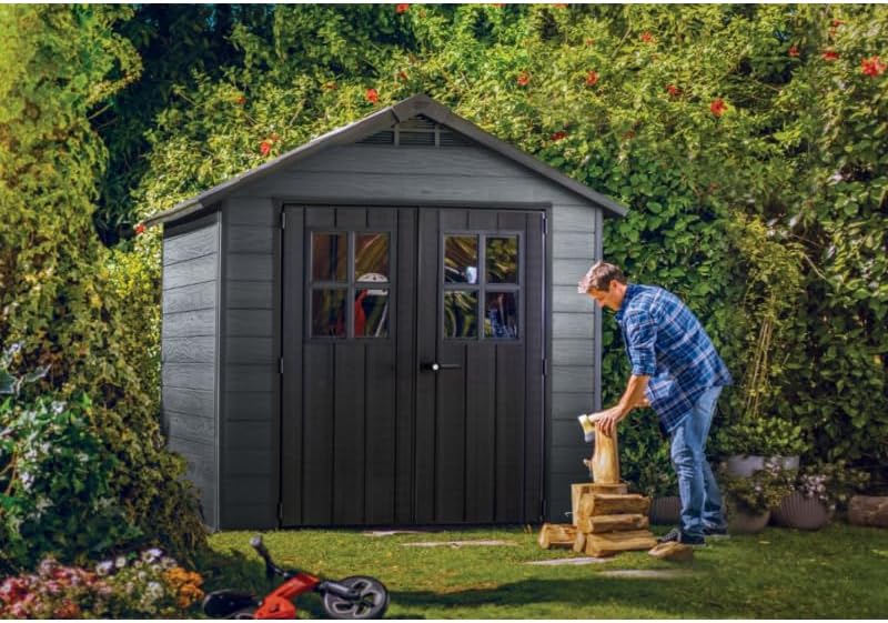 Image: The Keter Woodium 757-5 resin garden shed, anthracite grey, situated in a lush garden. A person is seen chopping wood near the shed's double doors, which feature two fixed windows.