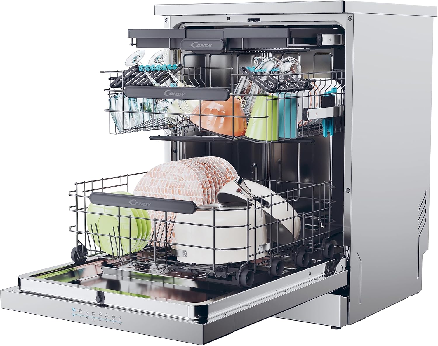 The Candy RapidÓ CF 6C4F1X is a free-standing dishwasher designed for domestic dish cleaning, offering a capacity of 16 place settings. It features Wi-Fi and Bluetooth connectivity, 8 washing programs, and innovative functions like Smart Basket and Smart Door for enhanced convenience and performance.
