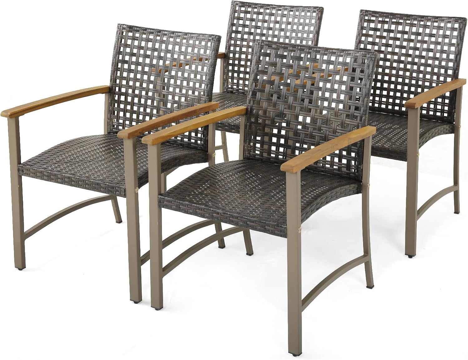 This set includes four durable patio dining chairs, constructed from sun-resistant PE wicker, heavy-duty metal, and natural acacia wood armrests. Designed for outdoor use, these chairs are suitable for various settings such as patios, decks, balconies, gardens, and poolside areas.