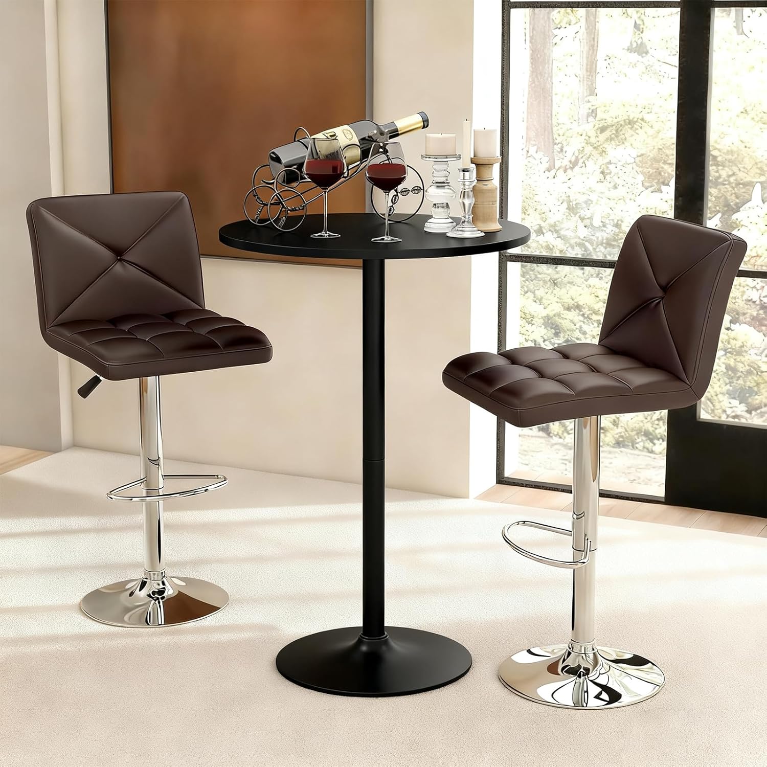 Image: The complete COSTWAY 3-piece bar table set, featuring a round black table and two brown adjustable swivel stools, positioned in a bright room.